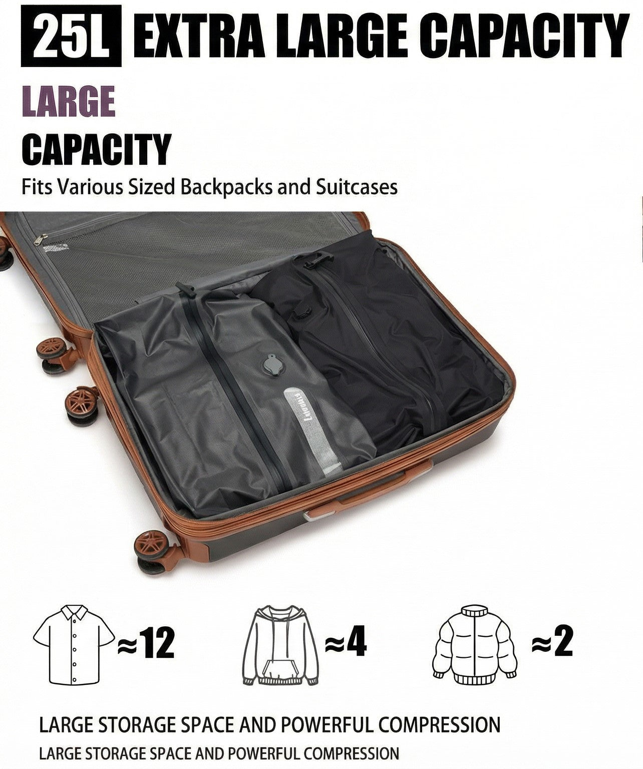 Our bags feature innovativeroll-to-compress technology. Simply seal the bag, then roll from the bottom - the one-way air valve automatically pushes air out. It's faster and more convenient than electric pumps!