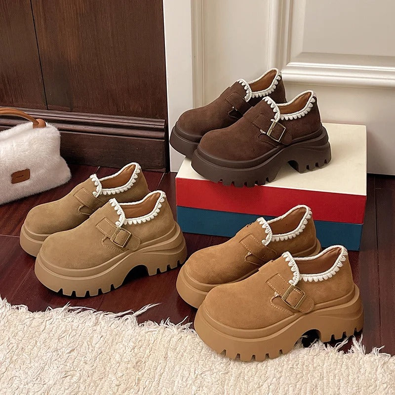 This shoe is a sophisticated mash-up of several key trends: the comfort and shape of a Birkenstock (often called "Birkibuk" or "Boston" style), the preppy elegance of a classic loafer, and the height-boosting power of a chunky platform sole. The intricate lace detail adds a unique, vintage-inspired feminine touch, making it a perfect fashion-forward choice for Fall 2025.